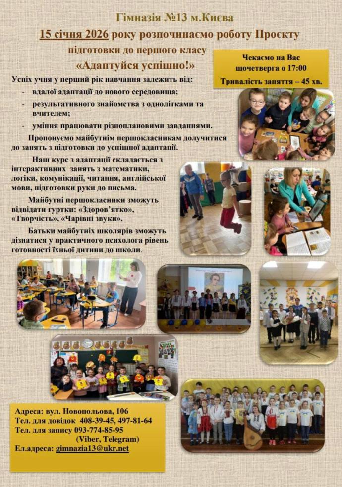 ЗАПРОШУЄМО БАТЬКІВ МАЙБУТНІХ ПЕРШОКЛАСНИКІВ ТА ЇХНІХ ДІТОК ПРИЄДНАТИСЯ ДО АДАПТАЦІЙНИХ ЗАНЯТЬ З 15 СІЧНЯ 2026 р
