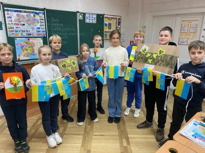 Вихованці 5-А класу разом з батьками беруть активну участь у волонтерській діяльності гімназії, виготовляючи патріотичні сувеніри та обереги, збираючи кошти на благодійних ярмарках